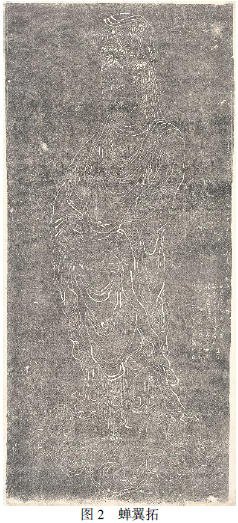 蝉翼拓是用极薄的纸施以淡墨捶拓而成。拓片墨色均匀如雾,温润如水,通透淡雅,拓痕肌理清凉幽静,在视觉上不及浓墨拓那样对比浓烈,却有薄如蝉翼和谈如罗纱的视觉效果(如图 2 所示)。同时文字处会显得清晰洁净,不会有墨色侵入字口的情况,它的精致也体现了轻柔适当的手上功夫和文人微妙的审美趣味。蝉翼拓在制作过程中最好选用六吉棉连纸,拉力强薄而细腻。用墨须精细,最好研制。拓制前在纸上试拓几下,观察墨色浓淡干湿程度,要特别注意扑子的洁净,保证扑面没有污渍和积墨。上墨时,须遵循宁浅勿深、宁干勿湿、宁轻勿重的原则为标准。蝉翼拓虽在用墨上较少,但是对墨色和力度的把控上要格外严谨,稍有不慎,极易出现墨点,字口纹饰含糊不清。蝉翼拓需拓纸不见扑墨痕迹,纸纹清晰,字口匀净不轻飘。