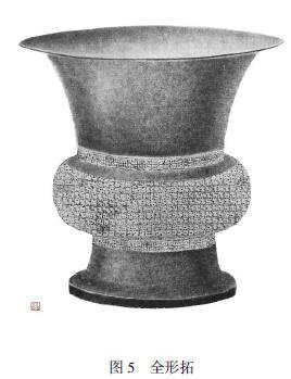 全形拓是以墨拓为主,结合绘图、剪纸、修饰等技术,运用素描透视原理,以墨迹的浓淡变化,尽可能地展现器物立体图形及真实质感的一种综合处理方式的传拓技法,对墨色运用的掌握也更为困难和关键。在施墨前要考虑光线问题,按器物各部分尺寸和大小比例,依光线的强弱和远近主次来处理。需制拓者在拓包一起一落中,时刻关注墨色浓淡渐变,在平面的纸上来表现其丰富多样的层次关系。器物凸出的部分要浓,凹下去的要淡,受光部分要用淡墨,背光部分就要用浓墨,分轻、重、浓、淡转变墨色,逐渐过渡。遇面面相邻要有深浅对比,明暗过渡处墨色要均匀,平缓自然。拓制后画面的点、线、面,黑、白、灰墨色层次要分明,突出纹饰的特点,更好地呈现出它固有的深浅、高低错落的变化,细部清晰明确,立体感强,使纹饰拓本有型而传神,突显器物繁复华丽的造型纹饰和构图的整体性,效果自然协调(如图 5 所示)。